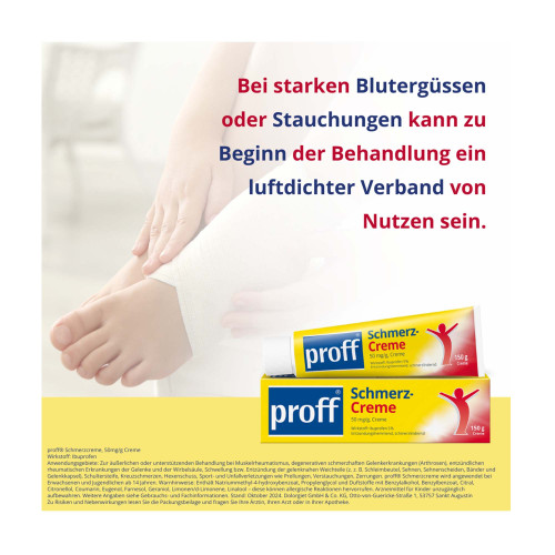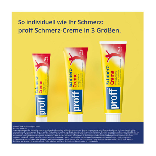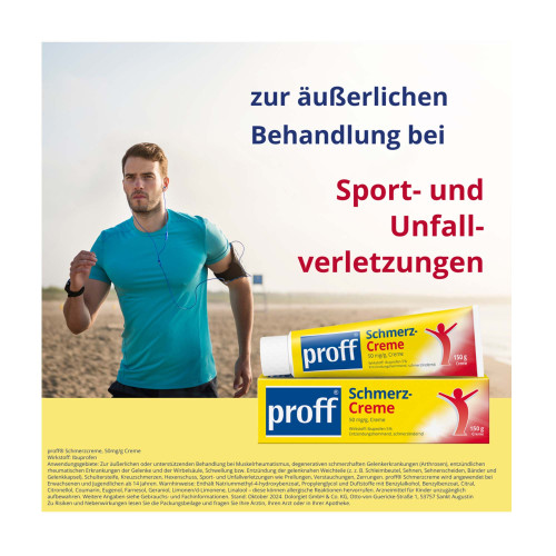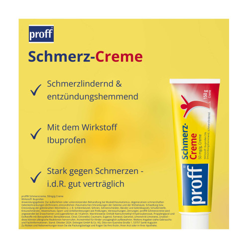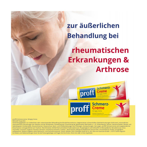 proff® Schmerzcreme 50 mg/g Creme. Wirkstoff: Ibuprofen. Anwendungsgebiete: Zur äußerlichen oder unterstützenden Behandlung bei Muskelrheumatismus, degenerativen schmerzhaften Gelenkerkrankungen (Arthrosen), entzündlichen rheumatischen Erkrankungen der Gelenke und der Wirbelsäule, Schwellung bzw. Entzündung der gelenknahen Weichteile (z. z. B. Schleimbeutel, Sehnen, Sehnenscheiden, Bänder und Gelenkkapsel), Schultersteife, Kreuzschmerzen, Hexenschuss, Sport- und Unfallverletzungen wie Prellungen, Verstauchungen, Zerrungen. proff® Schmerzcreme wird angewendet bei Erwachsenen und Jugendlichen ab 14 Jahren. Warnhinweise: Enthält Natriummethyl-4-hydroxybenzoat, Propylenglycol und Duftstoffe mit Benzylalkohol, Benzylbenzoat, Citral, Citronellol, Coumarin, Eugenol, Farnesol, Geraniol, Limonen/d-Limonene, Linalool – diese können allergische Reaktionen hervorrufen. Arzneimittel für Kinder unzugänglich aufbewahren.
