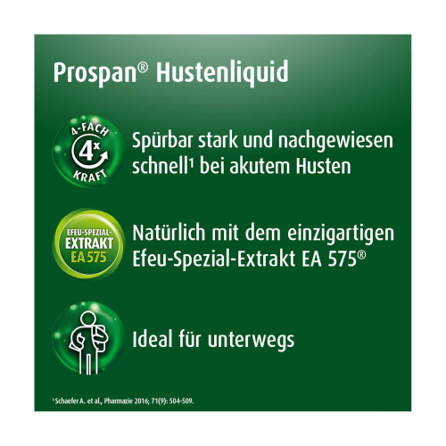 Prospan® Hustenliquid, Flüssigkeit zum Einnehmen. Wirkstoff: Efeublätter-Trockenextrakt. Anwendungsgebiete: Zur Besserung der Beschwerden bei chronisch-entzündlichen Bronchialerkrankungen; akute Entzündung der Atemwege mit der Begleiterscheinung Husten. Hinweis: Bei länger anhaltenden Beschwerden oder bei Auftreten von Atemnot, Fie-ber wie auch bei eitrigem oder blutigem Auswurf, sollte umgehend der Arzt aufgesucht werden.Warnhinweis: Enthält Sorbitol.