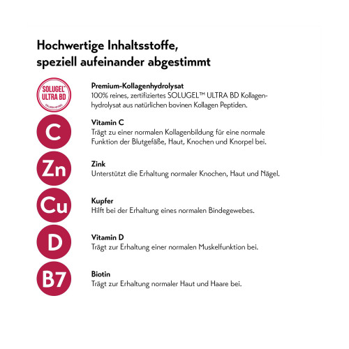 99,7% SOLUGEL™- Kollagenhydrolysat (Rind), L-Ascorbinsäure, Zinkpicolinat, Kupfergluconat, Cholecalciferol, D-Biotin.