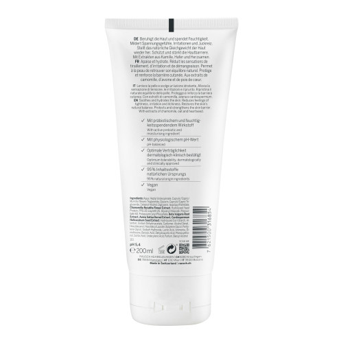 93 % der veganen Rezeptur Made in Switzerland besteht aus Inhaltsstoffen natürlichen Ursprungs, darunter Extrakte aus Hafer, Kamille und Herzsamen. Der physiologische pH-Wert von 5,4 macht die Body Lotion besonders hautschonend – für die federzarte Pflege, die sensible und sehr trockene Haut beruhigt und intensiv verwöhnt.