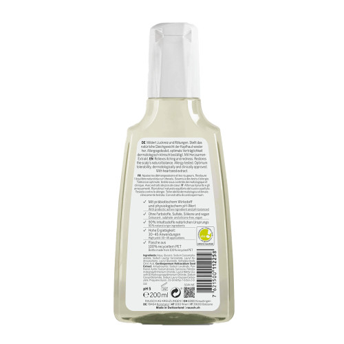 Für die besonders milder Rezeptur setzen die Entwicklerinnen auf 90 % Inhaltsstoffe natürlichen Ursprungs – darunter wertvollen Herzsamen-Extrakt. Die vegane und silikonfreie Rezeptur wird in Kreuzlingen am Bodensee hergestellt. Um die Hautbarriere optimal zu unterstützen, verfügt das Shampoo über einen physiologischen pH-Wert von 5,0 und kommt ganz ohne Farbstoffe aus. Die optimale Verträglichkeit ist dermatologisch-klinisch bestätigt und von Service Allergie Suisse mit dem aha! – Gütesiegel ausgezeichnet. Für die mildeste Reinigung wird bewusst auf Parfüm verzichtet, deshalb duftet es nur ganz dezent nach Noten von Baumwolle und frisch geschnittenem Gras.