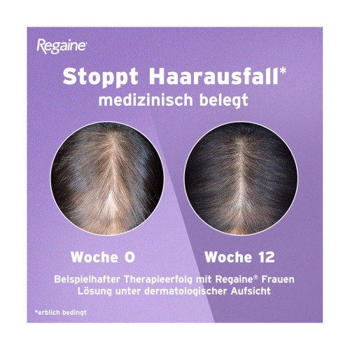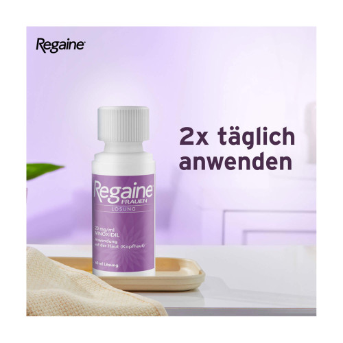 Regaine® Frauen. Wirkstoff: Minoxidil. Anwendungsgebiete: Regaine Frauen stabilisiert bei Frauen den Verlauf der androgenetischen Alopezie vom weibl. Typ (charakteristische anlagebedingte diffuse Kopfhaarverdünnung im Scheitelbereich). Die Behandlung mit Regaine Frauen fördert das Haarwachstum und kann so dem Fortschreiten dieses Haarverlustes entgegenwirken.Warnhinweis: Enthält Propylenglycol.