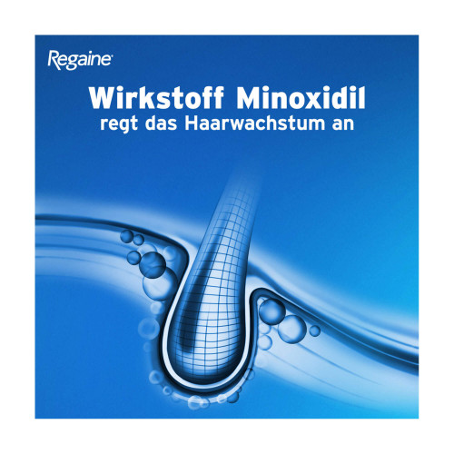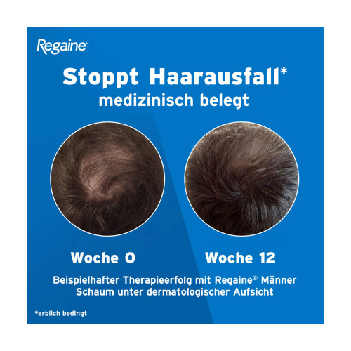 Regaine® Männer. Wirkstoff: Minoxidil. Anwendungsgebiete: Regaine Männer Schaum stabilisiert den Verlauf des anlagebedingten Haarverlustes (androgenetische Alopezie) im Tonsurbereich der Kopfhaut bei Männern im Alter von 21-49 Jahren. Die Behandlung kann so dem Fortschreiten des anlagebedingten Haarverlustes entgegenwirken. Beginn und Ausmaß können individuell unterschiedlich sein u. sind nicht vorhersagbar.