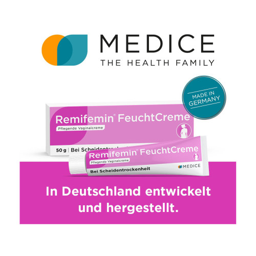 Remifemin® FeuchtCreme ist eine angenehm geschmeidige Creme, die zur Anwendung beim Beschwerdebild Scheidentrockenheit entwickelt wurde. Sie ist frei von Hormonen (Östrogenen) und kann deshalb auch zusammen mit einer Hormontherapie oder im Wechsel mit Hormon-(Östrogen-)haltigen Vaginalcremes oder Vaginalzäpfchen angewandt werden. Remifemin® Feucht-Creme wirkt sich positiv auf die Scheidenflora aus: Durch den Zusatz von Milchsäure ist die Creme auf einen pH-Wert von 4,2-4,5 eingestellt und unterstützt damit die Erhaltung eines natürlichen pH-Wertes in der Scheide.