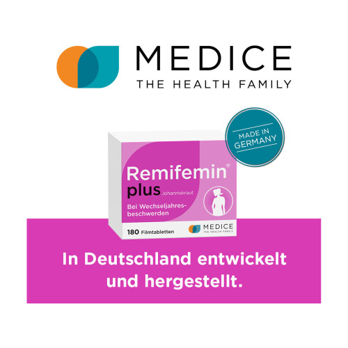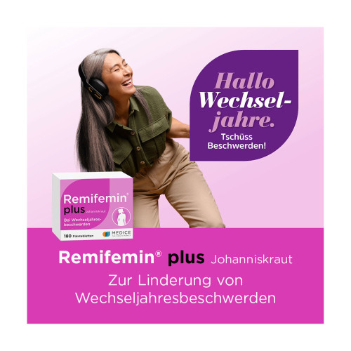 Remifemin® plus Johanniskraut. Anwendungsgebiete: Zur Linderung von Hitzewallungen und übermäßigem Schwitzen in den Wechseljahren, wenn diese Symptome mit zusätzlichen psychischen Wechseljahresbeschwerden wie z.B. Verstimmungszuständen, Nervosität und Reizbarkeit einhergehen. Warnhinweis: Enthält pro Filmtablette 163 mg Lactose (Milchzucker) und (3-sn-Phosphatidyl)cholin (Lecithin aus der Sojabohne).