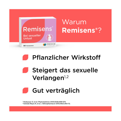 Remisens Filmtabletten. Wirkstoff: 225 mg Damianablätter-Trockenextrakt. Anwendungsgebiete: Traditionelles pflanzliches Arzneimittel zur Anwendung als Aphrodisiakum bei nachlassendem sexuellem Verlangen. Remisens® ist ein traditionelles Arzneimittel, das ausschließlich aufgrund langjähriger Anwendung für das Anwendungsgebiet registriert ist.