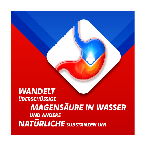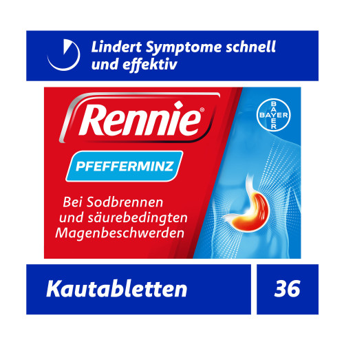 Rennie®, Pfefferminz Kautabletten. Wirkstoffe: Calciumcarbonat/ schweres, basisches Magnesiumcarbonat. Anwendungsgebiete: Zur symptomatischen Behandlung von Erkrankungen, bei denen die Magensäure gebunden werden soll, wie z. B.: Sodbrennen und säurebedingte Magenbeschwerden; Magen- und Zwölffingerdarmgeschwüre (Ulcus ventriculi oder Ulcus duodeni). Warnhinweise: Enthält Sucrose (Zucker).