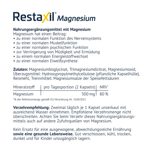 - Personen, die ihre normale Muskelfunktion und psychische Balance unterstützen möchten – Restaxil® Magnesium unterstützt die normale Muskelfunktion und trägt zur Reduktion von Müdigkeit und Erschöpfung bei.