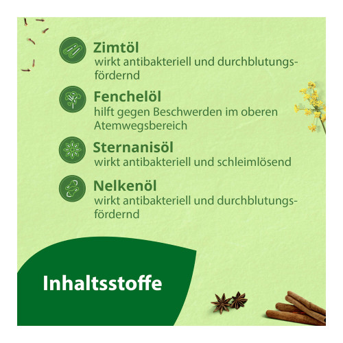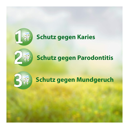 Wirkstoffe aus Salbei, Fenchel, Nelke, Pfefferminze, Thymian; 1450 ppm Fluorid in Form von Natriumfluorid und Dicalciumphosphat als Putzkörper.