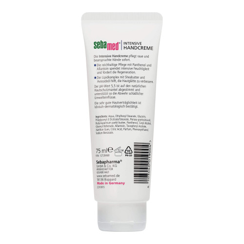 Intensive Pflege für raue und beanspruchte Hände Die Intensive Handcreme pflegt raue und beanspruchte Hände sofort und trägt zum Schutz vor Austrocknung bei. Die reichhaltige Pflege mit Panthenol und Allantoin spendet intensive Feuchtigkeit und fördert die Regeneration. Der Lipidkomplex mit Sheabutter und Avocadoöl hilft, die Hautglätte zu verbessern. Der pH-Wert 5,5 ist auf den natürlichen Hautschutzmantel abgestimmt und unterstützt so die Abwehr schädlicher Umwelteinflüsse. Die sehr gute Hautverträglichkeit ist klinisch dermatologisch getestet. Sebamed Intensive Handcreme eignet sich außerdem insbesondere für Menschen mit Allergien und Intoleranzen.