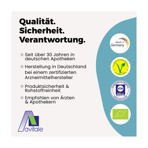 Die tägliche Verzehrempfehlung darf nicht überschritten werden. Nahrungsergänzungsmittel sind kein Ersatz für eine ausgewogene und abwechslungsreiche Ernährung und gesunde Lebensweise.