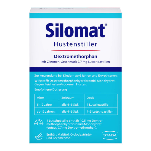 Silomat® Hustenstiller Dextromethorphan mit Zitronen-Geschmack 7,7 mg Lutschpastillen. Wirkstoff: Dextromethorphanhydrobromid-Monohydrat. Anwendungsgebiete: Zur Anwendung bei Kindern ab 6 Jahren und Erwachsenen. Zur symptomatischen Behandlung von Reizhusten. Bei Reizhusten handelt es sich um einen trockenen Husten, bei dem kein Schleim abgehustet wird (unproduktiver Husten). Warnhinweise: Nicht mehr und nicht länger anwenden als empfohlen. Enthält Maltitol, Cyclodextrin(e) und Levomenthol. Das Honigaroma enthält Safrol.