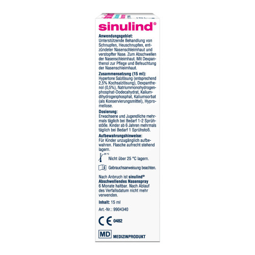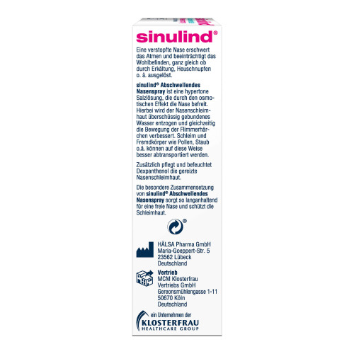 sinulind® Abschwellendes Nasenspray ist eine hypertone Kochsalzlösung, die durch ihren natürlichen abschwellenden Effekt, der auf Osmose beruht, die Nase befreit. Überschüssiges, gebundenes Wasser wird der Nasenschleimhaut entzogen und gleichzeitig die Bewegung der Flimmerhärchen verbessert. Schleim und Fremdkörper wie Pollen, Staub etc. können auf diese Weise besser abtransportiert werden. Zusätzlich pflegt und befeuchtet Dexpanthenol die gereizte Nasenschleimhaut. Die besondere Zusammensetzung von sinulind® Abschwellendes Nasenspray sorgt so langanhaltend für eine freie Nase und schützt die Schleimhaut.