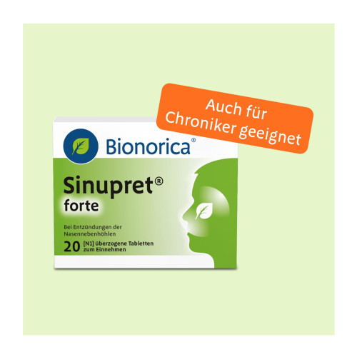 Sinupret forte, Überzogene Tabletten. Anwendungsgebiet: Bei akuten und chronischen Entzündungen der Nasennebenhöhlen. Warnhinweis: Enthält Glucose, Lactose, Saccharose und Sorbitol.