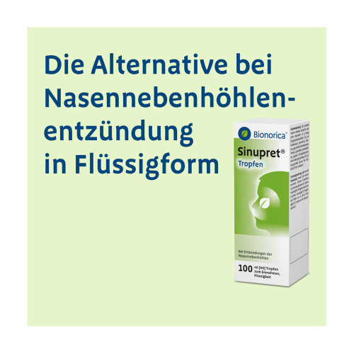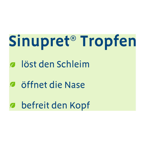 Sinupret Tropfen, Tropfen zum Einnehmen, Flüssigkeit. Anwendungsgebiet: Bei akuten und chronischen Entzündungen der Nasennebenhöhlen. Warnhinweis: Enthält 19 % (V/V) Alkohol.