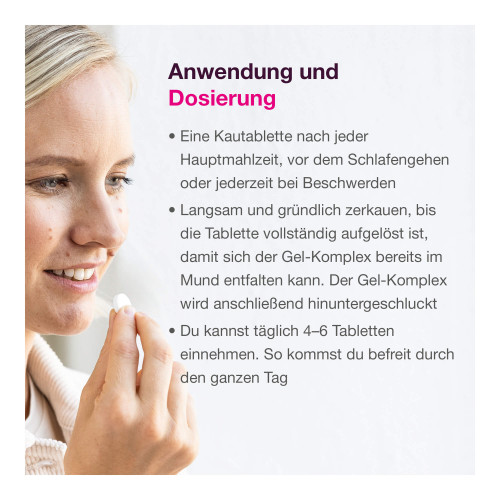 - Eine Kautablette nach jeder Hauptmahlzeit, vor dem Schlafengehen oder jederzeit bei Beschwerden.