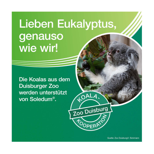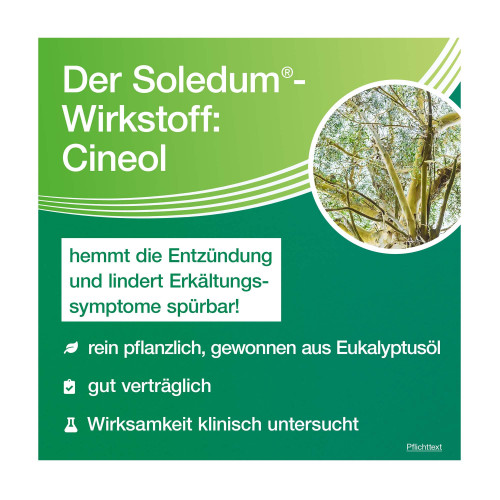 Soledum Balsam. Wirkstoff: Cineol. Anwendungsgebiete: Zur Verbesserung des Befindens bei Erkältungskrankheiten der oberen und unteren Atemwege (wie unkomplizierter Schnupfen, Heiserkeit, unkomplizierter Bronchialkatarrh, unkomplizierter Nasennebenhöhlenkatarrh). Soledum® Balsam ist ausschließlich für die äußere Anwendung (Inhalation, Einreibung) vorgesehen. Nicht zum Einnehmen.