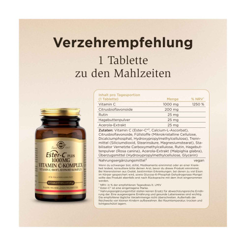 Der Körper kann selbst kein Vitamin C bilden, deshalb ist es besonders wichtig, das Vitamin über die Nahrung aufzunehmen. Unser Ester-C® ist ein ganz besonderes Vitamin-C-Produkt, das sich bei einer Dosierung von 1000 mg längere Zeit in den weißen Blutkörperchen hält und so das Immunsystem für ganze 24 Stunden optimal unterstützt. Damit auch der Magen gut mit dem Vitamin umgehen kann, wird Vitamin C an Mineralstoffe gebunden. Da an unser Vitamin C noch ein weiteres Shuttle angehängt ist, kann es nochmal besser aufgenommen und verwertet werden.