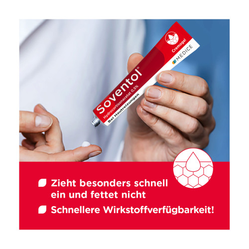 Soventol® Hydrocortisonacetat 0,5%. Wirkstoff: Hydrocortisonacetat (Ph. Eur.). Anwendungsgebiete: Bei mäßig ausgeprägten geröteten, entzündlichen oder allergischen Hauterkrankungen, bei denen schwach wirksame, niedrig konzentrierte Corticosteroide angezeigt sind. Warnhinweis: Keine Anwendung bei Kindern unter 6 Jahren ohne ärztliche Verordnung.