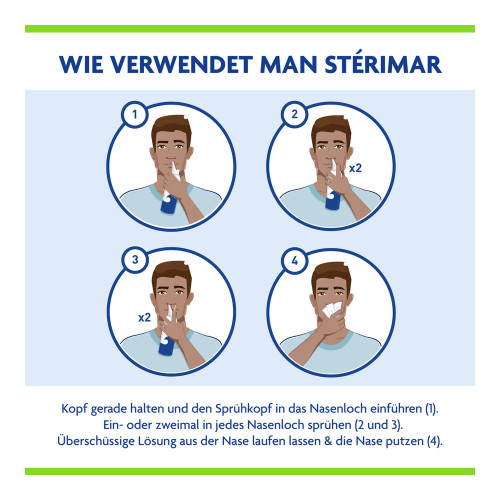 Als Spülung: Den Kopf zur Seite neigen, den Sprühkopf in das obere Nasenloch einführen und für 2 bis 3 Sekunden gedrückt halten. Überschüssige Lösung aus dem anderen Nasenloch laufen lassen und dann die Nase putzen. Nach jedem Gebrauch den Sprühkopf mit heißem Wasser reinigen.