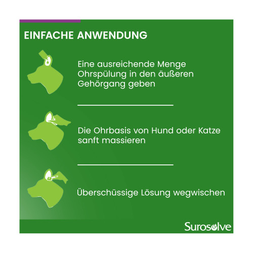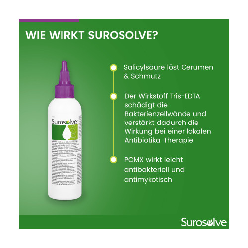 - Surosolve spült das Ohr und entfernt Ohrenschmalz, Schmutz sowie überflüssiges Sekret.