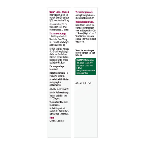 taxofit® Eisen + Vitamin C Weichkapseln. Anwendungsgebiete: Als Ergänzung bei unzureichender Eisenzufuhr. Warnhinweis: Enthält Sorbitol und Ponceau 4R.
