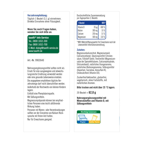Taxofit Magnesium 500+Calcium+Kalium Direkt-Granulat 20 St