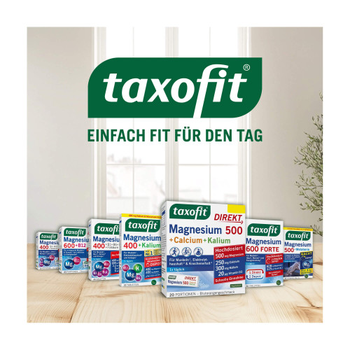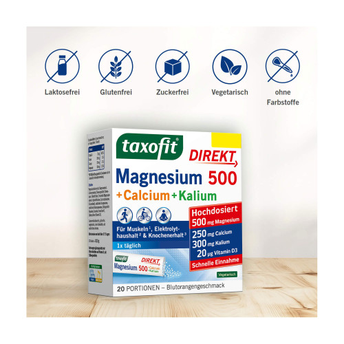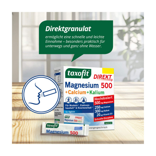 Körperlich aktive Menschen können durch einen verstärkten Muskelaufbau und höheren Energieverbrauch einen erhöhten Bedarf an Vitaminen und Mineralstoffen haben. taxofit® Magnesium 500 + Calcium + Kalium DIREKT enthält daher ausgewählte Mikronährstoffe zur Unterstützung der Muskelfunktion1, des Elektrolythaushaltes2, der Erhaltung normaler Knochen3 und des Energiestoffwechsels4. Das Direkt Granulat ermöglicht eine schnelle Aufnahme und ist leicht einzunehmen. Besonders praktisch für unterwegs und ganze ohne Wasser.