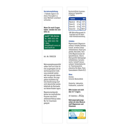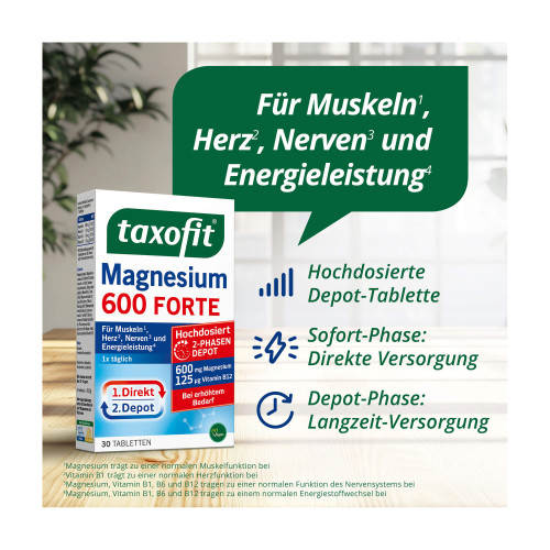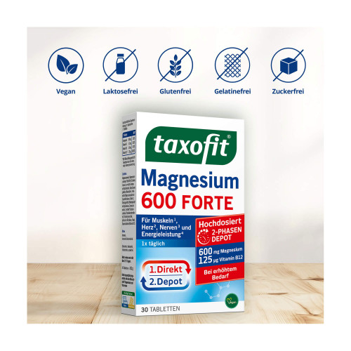Wer sein Leben mit viel Engagement und Einsatz herausfordernd gestaltet, sollte seinen Körper gut versorgen: taxofit® Magnesium 600 FORTE bietet mit dem besonders hochdosierten Magnesium und den Vitaminen B1, B6 und B12 eine Unterstützung bei sportlichen Aktivitäten und beruflichen Herausforderungen. Magnesium sowie die Vitamine unterstützen die normale Funktion von Muskeln, Energiestoffwechsel sowie Nervensystem – für einen aktiven Lebensstil.