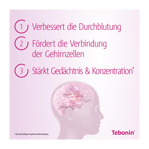 Tebonin® konzent® 240 mg. Wirkstoff: Ginkgo-biloba-Blätter-Trockenextrakt. Anwendungsgebiete: Zur Verbesserung einer altersbedingten Verschlechterung geistiger Fähigkeiten und der Lebensqualität bei leichter Demenz.