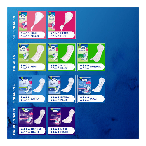 Abhängig von der Stärke des Urinverlusts können Sie TENA® Discreet Mini-Einlagen auch nachts verwenden. Bei einem größeren Harnverlust im Schlaf stehen zudem auch TENA® Produkte speziell für die Nacht zur Verfügung wie beispielsweise TENA® Discreet Normal Night.