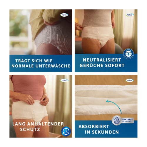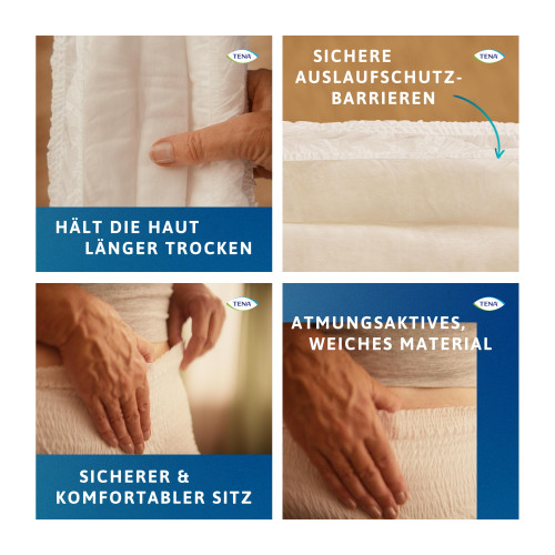 Die Kombination aus flexiblen Stretch-Einsätzen und elastischen Beinöffnungen gewährleistet eine körpernahe und bequeme Passform. Die atmungsaktiven, textilähnlichen Seitenteile des Inkontinenzschutzes halten die Haut durch gute Luftzirkulation trocken und unterstützen die natürliche Gesundheit der Haut.