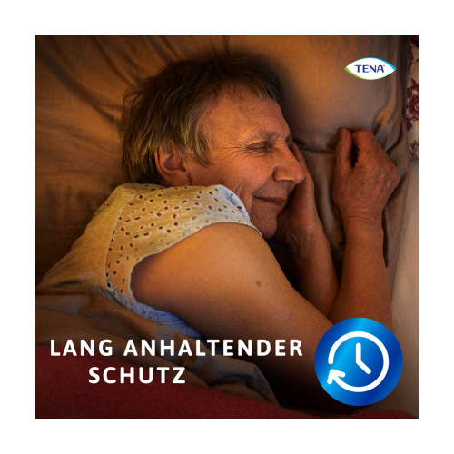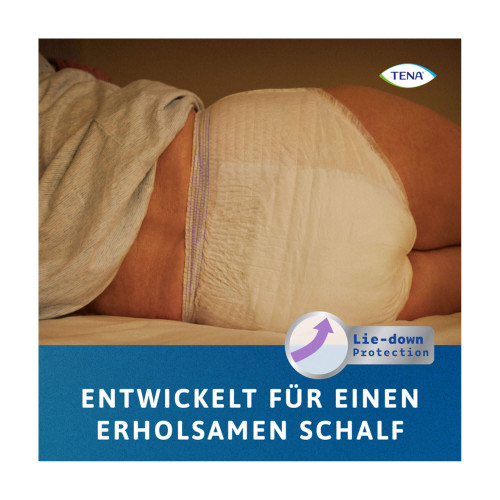 Die innovative Lie Down Protection Technologie wurde von Tena eigens für zuverlässigen Inkontinenzschutz in der Nacht und für Menschen, die aus gesundheitlichen Gründen viel liegen müssen, entwickelt. Die extra große Schutzzone im hinteren Bereich der Pants – dort wo Auslaufschutz im Liegen am meisten benötigt wird – sorgt mit einem besonders saugfähigen Absorptionskern dafür, dass Feuchtigkeit schnell aufgenommen und die Haut länger trocken bleibt.