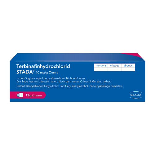 Terbinafinhydrochlorid STADA 10 mg/g Creme. Wirkstoff: Terbinafinhydrochlorid. Anwendungsgebiete: Zur Anwendung gegen bestimmte Hefen und Hautpilze, von denen der Fußpilz der bekannteste ist. Warnhinweis: Enthält Benzylalkohol, Cetylalkohol und Cetylstearylalkohol.