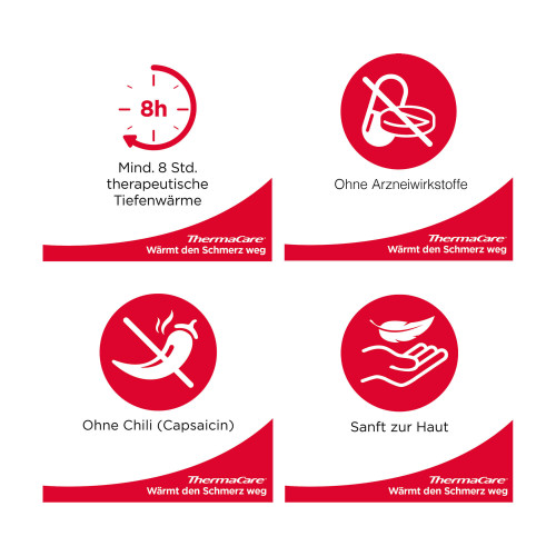 Ihr Risiko für Verbrennungen steigt mit zunehmendem Alter. Wenn Sie 55 Jahre oder älter sind, tragen Sie ThermaCare über dünner Kleidung und nicht während Sie schlafen. Sprechen Sie vor der Anwendung mit Ihrem Arzt/Ärztin, wenn Sie an Diabetes, Durchblutungsstörungen, Herzerkrankungen oder rheumatoider Arthritis leiden oder wenn Sie schwanger sind. Beenden Sie die Anwendung undsprechen Sie mit Ihrem Arzt/Ärztin, wenn Sie im Anwendungsbereich Beschwerden, Verbrennungen, Schwellungen, Ausschläge oder andere anhaltende Veränderungen Ihrer Haut feststellen, und wenn Ihre Schmerzen länger als 4 Tage anhalten oder sich verschlimmern.