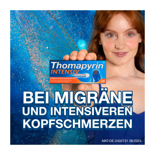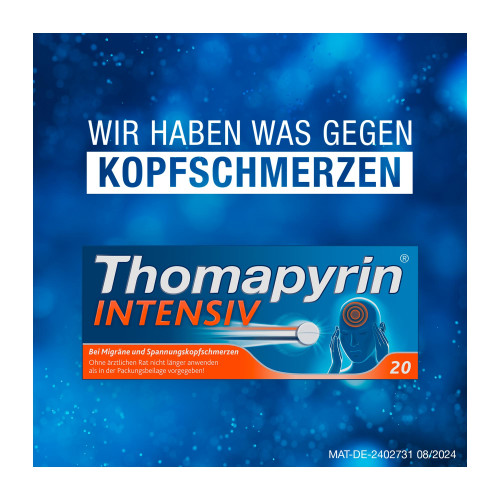 Thomapyrin intensiv Tabletten. Wirkstoffe: Acetylsalicylsäure, Paracetamol und Coffein. Anwendungsgebiete: Für Erwachsene und Jugendliche zur Behandlung von akuten Kopfschmerzen (z. B. Spannungskopfschmerzen) und Migräneanfällen (mit und ohne Aura). Warnhinweis: Schmerzmittel sollen längere Zeit oder in höheren Dosen nicht ohne Befragen des Arztes angewendet werden. Enthält Lactose.