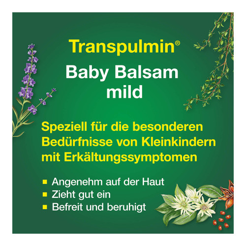 Zur Verbesserung des Befindens können Sie den Transpulmin Baby Balsam verwenden. In seiner Rezeptur vereint er sanfte, speziell auf Babys und Kinder abgestimmte hochwertige ätherischen Öle. Die ausgewogene Mischung aus ätherischen Ölen von Lavendel, Sternanis und Thymian hilft Ihrem Kind dabei zu entspannen und fördert eine ruhige Atmung.