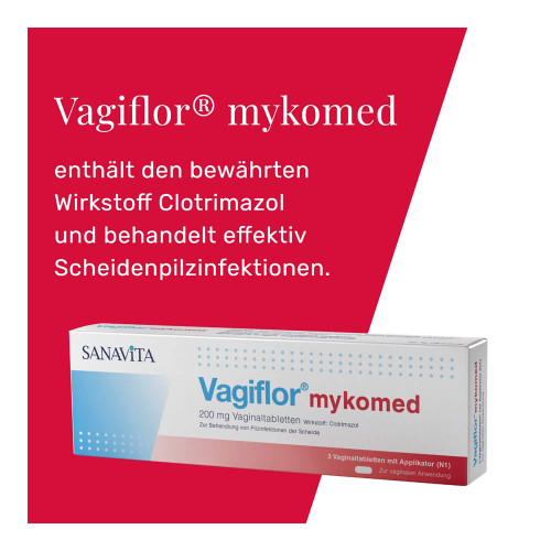 Vagiflor mykomed 200 mg Vaginaltabletten. Wirkstoff: Clotrimazol. Anwendungsgebiete: Ausfluss, bedingt durch Pilze (meist Candida); Entzündung der Scheide durch Pilze, Superinfektionen mit Clotrimazol-empfindlichen Bakterien.