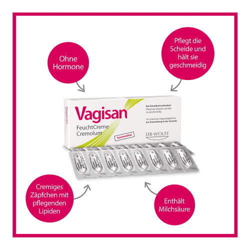 Das Vaginalzäpfchen von Vagisan versorgt die trockene Vagina mit Lipiden und lindert die durch Scheidentrockenheit hervorgerufenen Symptome wie z. B. Trockenheitsgefühl, Brennen, Juckreiz oder Scheidenschmerzen. Es schmilzt durch die Wärme der Scheide und bildet dort zusammen mit der Scheidenflüssigkeit eine Creme, die das Scheiden-Innere pflegt und geschmeidig macht. Die Vagisan FeuchtCreme Cremolum Zäpfchen sind praktisch in der Anwendung und dadurch besonders bequem auf Reisen oder wenn es schnell gehen soll.