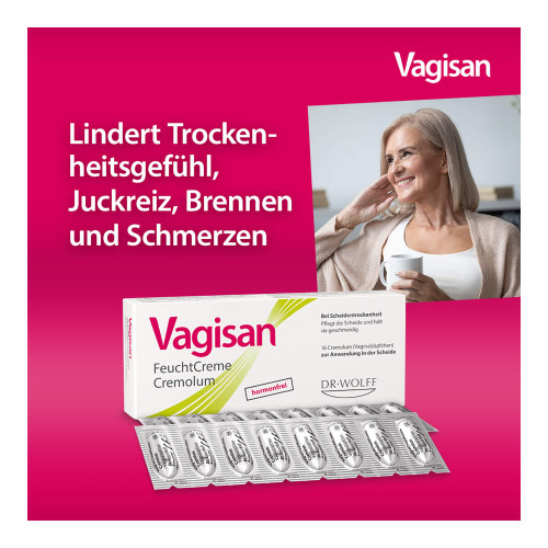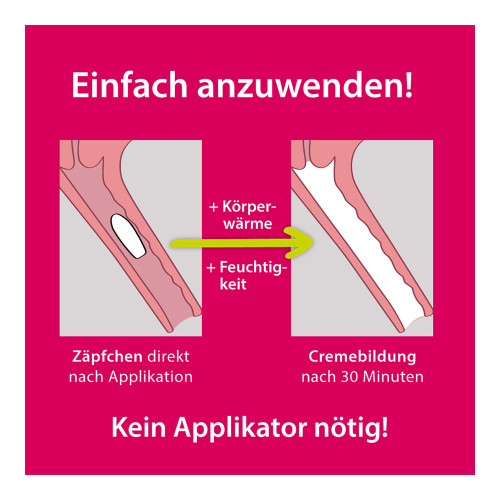 Für Frauen, die ein Brennen oder ein Jucken der Scheide verspüren und einen Applikator als unangenehm empfinden, gibt es Vagisan FeuchtCreme Cremolum. Die weichschmelzenden Zäpfchen werden ganz ohne Applikator angewendet und pflegen die Scheide.