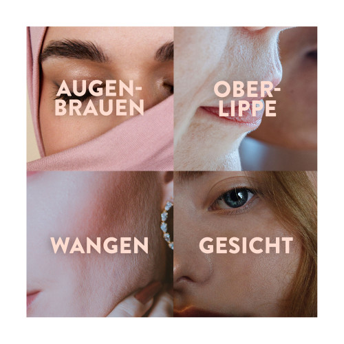 Für die Anwendung an Oberlippe, Wangen und Kinn geeignet. Nicht geeignet für Kopf, Gesicht, Augen, Nase, Ohren, Anal- oder Genitalbereich sowie Brustwarzen oder andere Körperpartien.