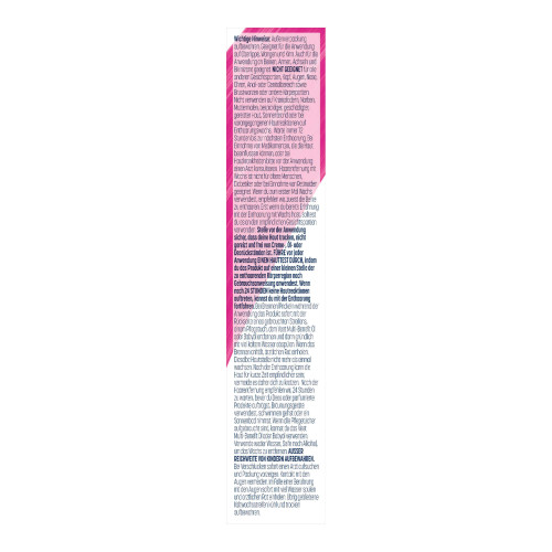 Nicht verwenden auf Krampfadern, Narben, Muttermalen, bei pickliger, geschädigter, gereizter Haut, Sonnenbrand oder bei vorangegangenen Hautreaktionen auf Enthaarungswachs.