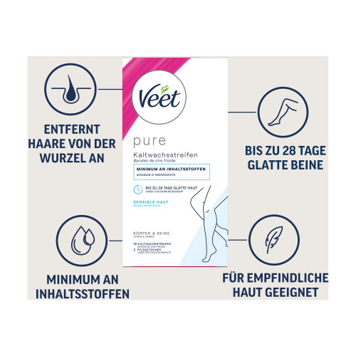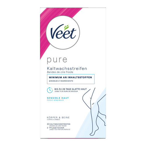 Zur Benutzung des Veet Pure Kaltwachsstreifen ziehen Sie den Streifen langsam auseinander und streichen Ihn auf der Haut glatt. Anschließend ziehen Sie den Kaltwachsstreifen entgegen der Haarwuchsrichtung ab und entfernen die übergebliebenen Wachsreste.