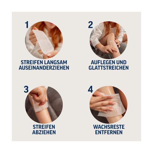 Die Kaltwachsstreifen eignen sich besonders gut für die Enthaarung sensibler Haut an den Armen und Beinen. Mithilfe der enthaltenen Pflegetücher lassen sich Wachsreste auf der Haut leicht entfernen.