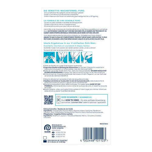 Die Waxing Streifen enthalten ein Minimum an Inhaltsstoffen und sind dermatologisch getestet. Das Kaltwachs greift selbst kurze Haare, entfernt sie schnell und einfach mitsamt der Wurzel und ermöglicht ein langanhaltendes Glättegefühl. Vor der Anwendung ist kein Reiben oder Erwärmen des Wachs nötig. Für eine unkomplizierte Haarentfernung ohne Rasieren – und somit auch weniger stoppeliges Nachwachsen ohne Risiko für Schnittverletzungen.
