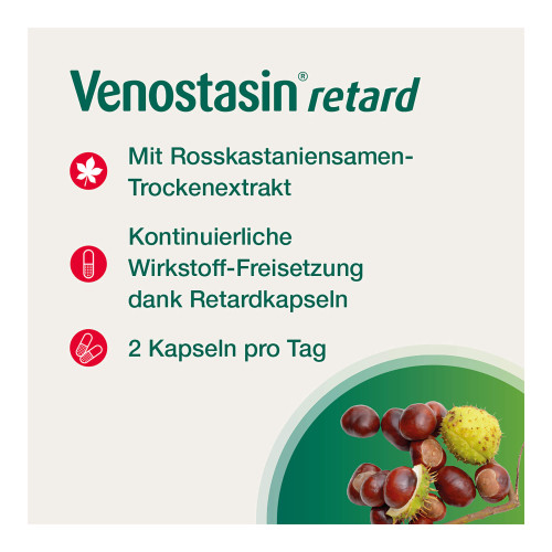 Venostasin® retard 50 mg Hartkapsel, retardiert. Wirkstoff: Rosskastaniensamen-Trockenextrakt. Anwendungsgebiete: Bei Erwachsenen zur Behandlung von Beschwerden bei Erkrankungen der Beinvenen (chronische Veneninsuffizienz), z.B. Schmerzen und Schweregefühl in den Beinen, nächtliche Wadenkrämpfe, Juckreiz und Ödeme.