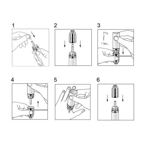 Achtung: Nach der Behandlung 3 Minuten abwarten. Dann das Schwämmchen mit einem Papiertaschentuch aus dem oberen Ende der Spraydose ziehen. Das Ende des Schwämmchens nicht mit bloßen Händen anfassen, da sonst die Gefahr besteht, dass sich die Haut erneut mit dem Warzenvirus infiziert. Das Schwämmchen muss nach jeder Behandlung entsorgt werden. Für jede Warze einen der mitgelieferten Einwegapplikatoren verwenden.