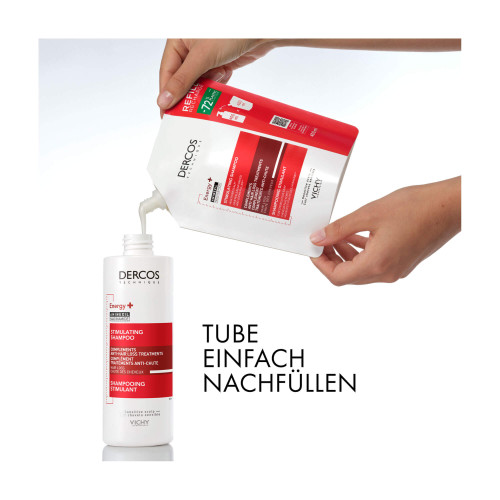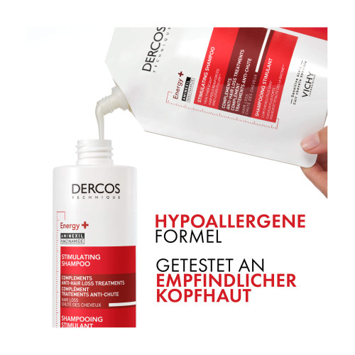 Das Dercos Vital-Shampoo+ mit Aminexil® im umweltfreundlichen Nachfüllpack von Vichy bietet eine effektive Pflege gegen Haarausfall. Vital-Shampoo für sichtbar mehr Fülle und Vitalität Das Dercos Vital-Shampoo ist speziell formuliert, um dünner werdendes Haar bis in die Spitzen mit neuer Vitalität zu versorgen. Durch die Kombination aus Aminexil® und vitalisierenden Vitaminen wird das Haar sichtbar kräftiger, voller und widerstandsfähiger. Das sanfte, stimulierende Shampoo reinigt Kopfhaut und Haare auf schonende Weise, fördert die Durchblutung und unterstützt die Haarwurzeln. Mit vulkanischem Wasser aus Vichy angereichert, trägt dieses Shampoo zur allgemeinen Kopfhautgesundheit bei. Es ist die ideale Ergänzung zur DERCOS Aminexil® Pro Intensivampullen-Kur.