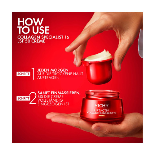 Vor der Verwendung der LIFTACTIV Collagen Specialist 16 Creme LSF 50 morgens das Gesicht gründlich reinigen und im Anschluss mit einem weichen Handtuch abtrocknen. Ein paar Tropfen LIFTACTIV Collagen Specialist 16 Bonding Serum auf die Gesichtshaut geben und kurz einziehen lassen. Nun eine etwa erbsengroße Menge der Creme entnehmen und auf das Gesicht auftragen. Anschließend die Tagespflege mit den Fingerspitzen sanft von innen nach außen einmassieren, bis die Creme vollständig von der Haut aufgenommen und eingezogen ist.