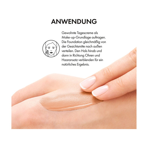Nach dem Auftragen Ihrer Tagespflege als Grundlage verteilen Sie das Make-up mit den Fingerspitzen durch sanft glättende Bewegungen von der Gesichtsmitte nach außen. Für eine natürliche Wirkung verstreichen Sie sorgfältig die Ränder an Hals, Ohren und Haaransatz.